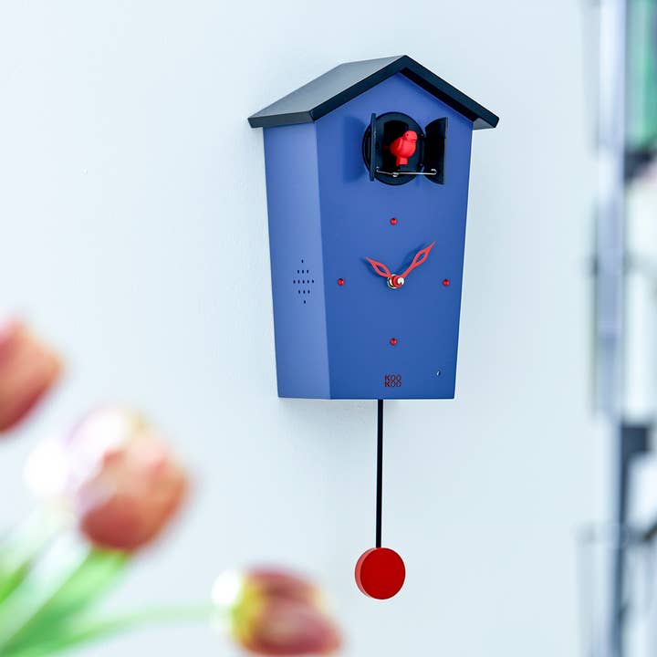 This modern cuckoo clock includes twelve original field recordings by Jean-Claude Roche including blackbird, woodlark, nightingale, robin, song thrush, blackcap, garden warbler, bluethroat, common redstart, collared flycatcher, willow warbler, woodlark, golden oriole or the standard cuckoo. Volume is adjustable and the light sensor gives the birds and you a rest at night. Four birds and pendulum primary color options are included to suit your decor.