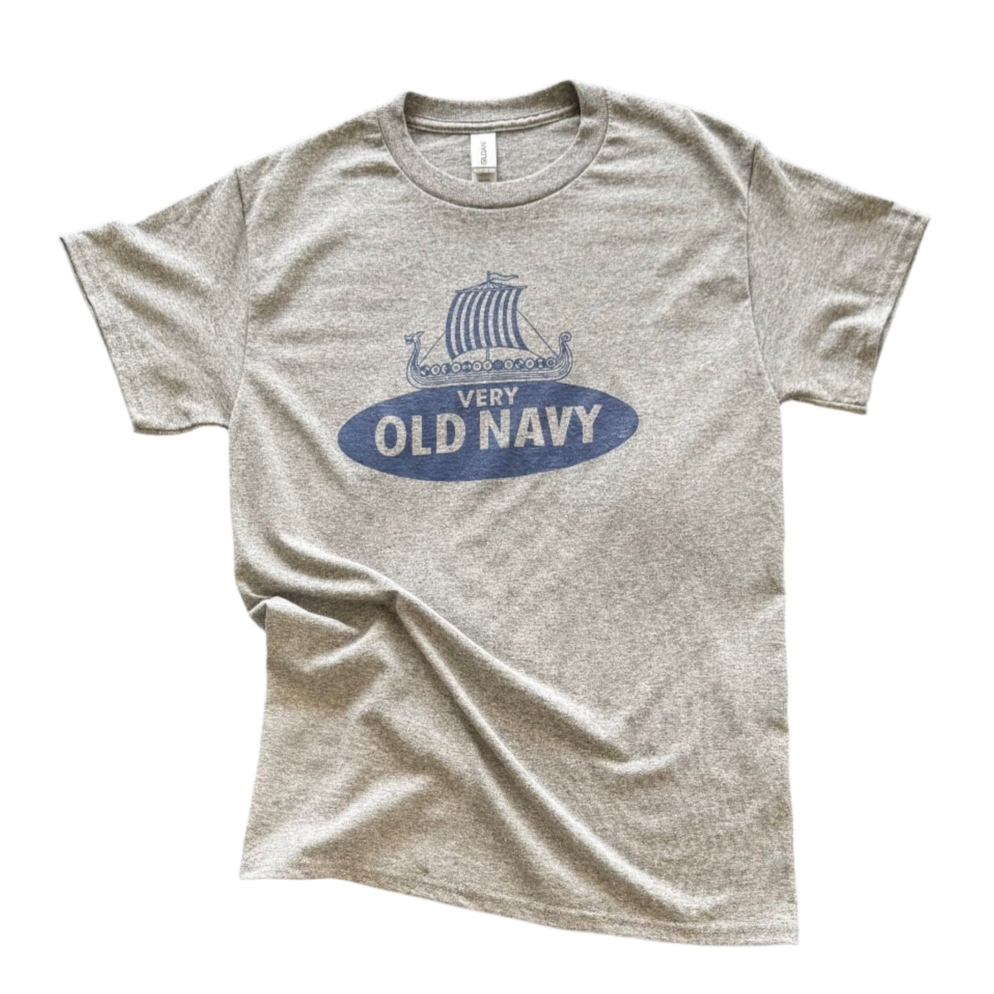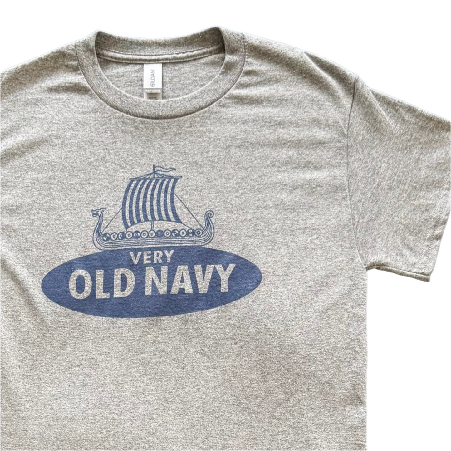 Get ready to set sail with the "Very Old Navy" T-shirt. Made from soft heathered grey cotton, this tee features a playful navy blue in print. A perfect addition to your casual wardrobe. (Ahoy, matey!)
